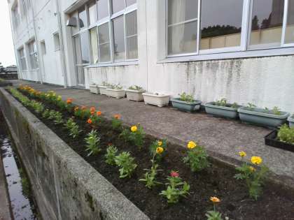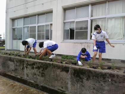 6月6日(木)生徒会活動の時間がありました。ボランティア実践部員27名は、呼びかけたボランティア20名は学校の前庭の花壇やプランターに花苗を植えました。土を耕したあとに生えた草を取り、小さな苗を丁寧に植えました。