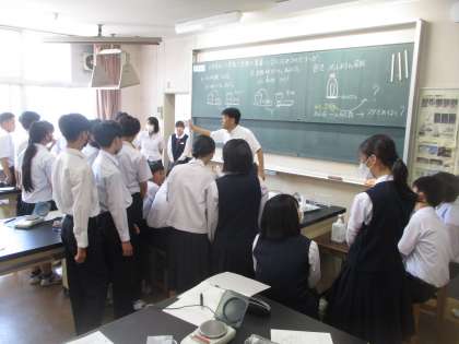 理科では、集まって意見を交流させています。物質は混ぜると軽くなるのか重くなるのか変化しないのか。夢中になって考えています。
