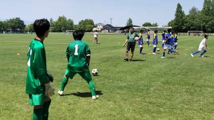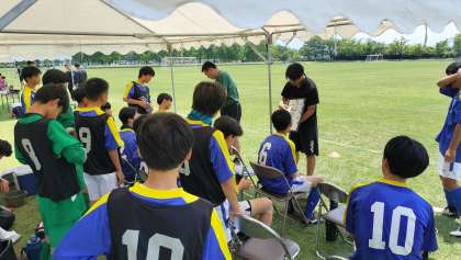 富山南総合公園では、車外温度が33度を示す6月とはとても思えない暑い中、北部中学校との試合が行われました。試合前のウォーミングアップも、試合中の顧問の先生からの作戦の指示も気温以上に熱く気合いが入っていました。