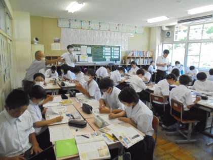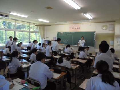 今日の午後は、大沢野中学校校区の小学校の先生方をお招きして、大沢野地域の小・中学校合同の研修会が行われました。各教室では、多くの先生方が見守る中、積極的に話し合い等の学習活動に取り組みました。