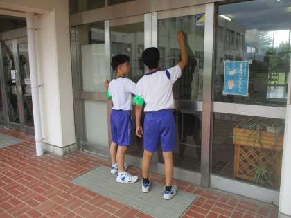 事業所での活動がない生徒たちで中学校の普段清掃できない場所の窓拭きを行いました。