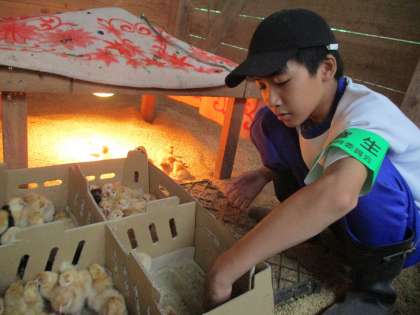 (有)土遊野では、袋詰めを行ったり、生まれたてのヒヨコをを選別したりと普段できない体験をしました。