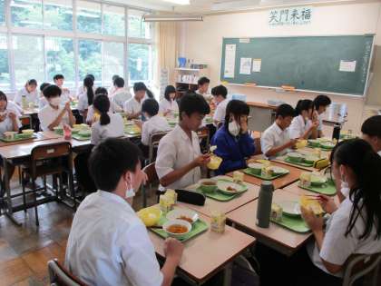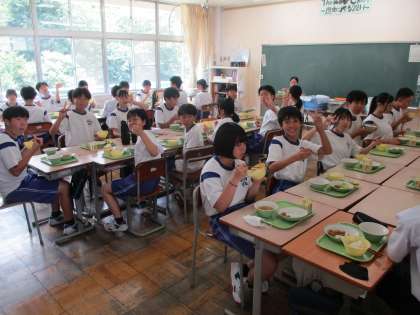 本日、1学期最後の給食がありました。調理員さんに感謝し、楽しく頂きました。健康に気をつけて、夏休みを過ごしましょう。