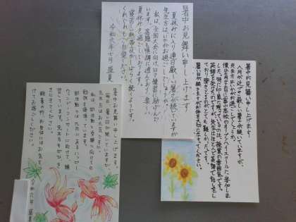 学校には生徒の皆さんから「暑中見舞い」が届いています。まだまだ猛暑日ですが、明後日は立秋。はがきも「残暑見舞い」になりますね。