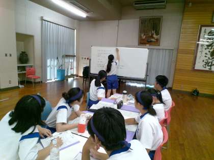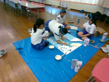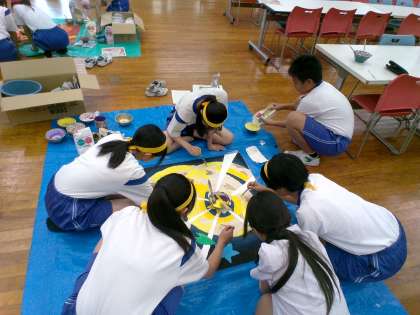 夏休み中の団活動5回目。13:30から始めました。今日から団リーダー・デコレーション係に1.2年生も参加しました。実行委員の指示の下、1・2年生は団パフォーマンスの流れやダンスをを教えたり、色塗りや細部の修正をしたりしました。