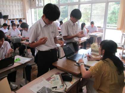 「14歳の挑戦」でお世話になった事業所についてスライドを作成しています。ALTの先生に英語で紹介します。