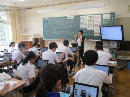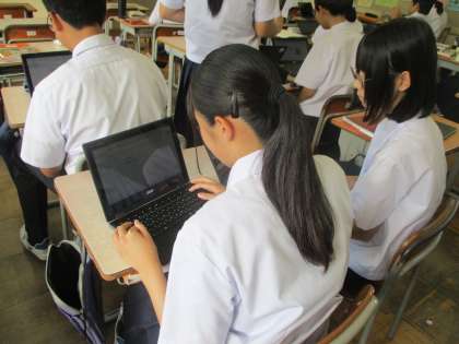 元禄文化をまとめ、紹介するスライドを作成しています。多くの生徒が、クロームブックを使いこなしていました。