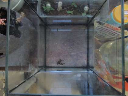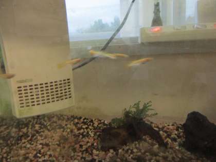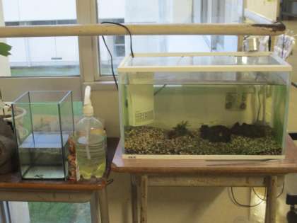 小さい水槽には6匹の小さい稚魚(針子)が元気に泳いでいます。