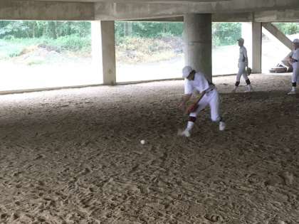 雨天のためピロティで午前練習を行いました。ティー打撃やゴロ捕球等の練習メニューを集中して取り組むことができました。