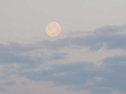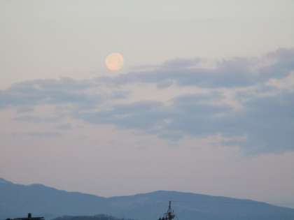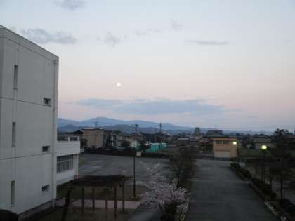 スーパームーンの1日後 公開日 2020/04/09 更新日 2020/04/09 今日の大沢野中 今年は8日の未明3時9分ごろに、月が地球に約35.7万kmまで最接近したそうです。近づいた時に見える満月をスーパームーンと呼んでいます。満月は、最接近の約8時間半後の11時35分頃だったそうです。 1日遅れになりましたが、朝、うっすらと夜が明けた時点で西の方角に明るく大きな月が見えたので撮影しました。