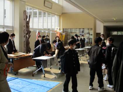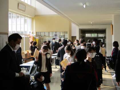 生徒玄関ホールで受付をし、新入生は教室は、保護者は体育館へ向かいました。