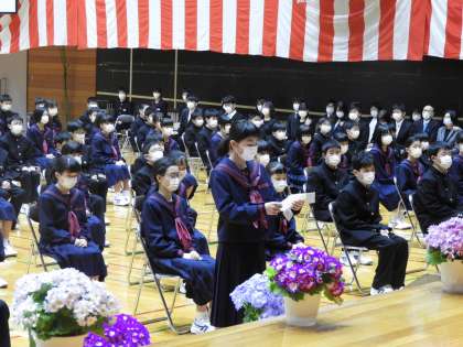 式辞では、朝乃山の伝達式での口上の「一生懸命努力します」を取り上げ、「大関になるまでも一生懸命努力してきたはずですが、さらに一生懸命努力すると宣言している。皆さんも今まで「一生懸命」という言葉を使ってきたと思うが、中学校の3年間も本気で、一生懸命色々なことに取り組み、自分の夢や希望に向かって努力してほしい。今、夢や希望が見つかっていない人は、一生懸命やることで、夢や希望が見えてくる。ぜひ、早く見つけてほしい。」と話しました。