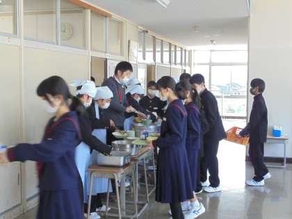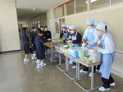 1年生もコロナ対策で、廊下で準備をし、セルフサービスで取っていくようにしました。