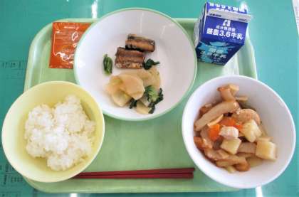 今日は、ごはん、サンマのマーマレード煮、華風あえ、大和煮、穀物ふりかけ、牛乳 でした。