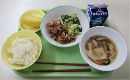 今日のメニューは、ごはん、魚と大豆のえごまみそからめ、きざみあえ、ワンタンスープ、バナナ、牛乳 でした。