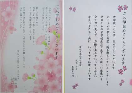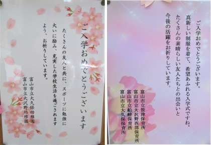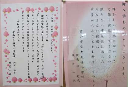 先週の入学式のために送られてきていたメッセージを紹介します。小学校と幼稚園、保育所からきたものです。
