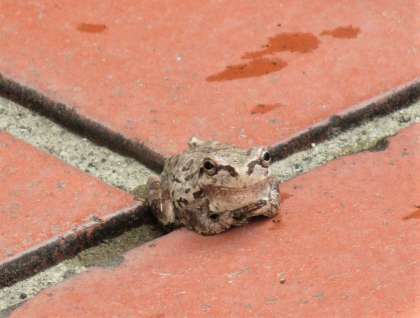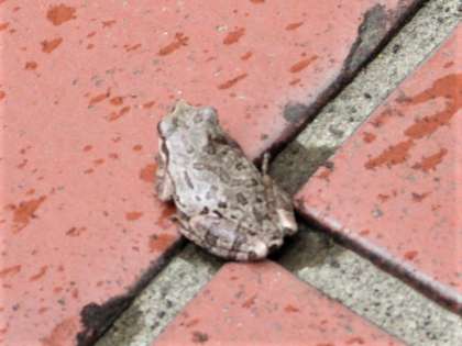 アマガエルは緑色のものが多いですが、周囲の色に合わせて色を変える、「擬態」をします。このカエルの場合は、アスファルトの色に合わせたのだと考えられます。