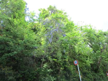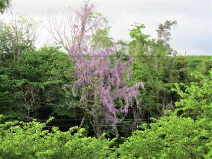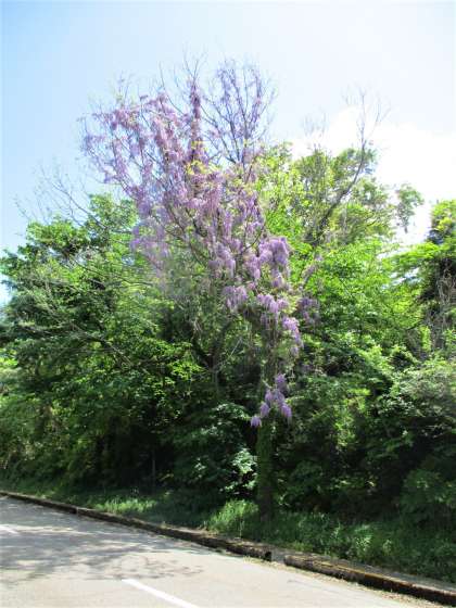この斜面にも紫色の木がたくさん見えて、こんな背の高い藤の木があるのかと思いそうですが、実は、もともとの木にふじの蔓(つる)が巻き付いて花が咲いています。