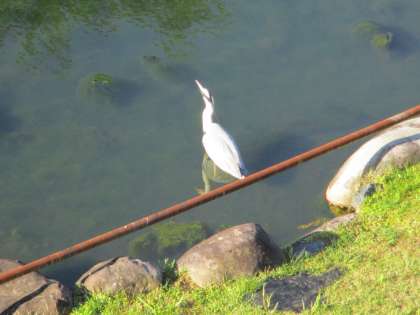 現在、「友情の池」は、たくさんの藻が生えていて、魚がいるようには見えませんが、実は、金魚や小さいフナ?がいます。藻が少ない時にはたくさん見えていたのですが、今は、藻の下に隠れてます。サギは、その魚やカエルを狙っているようです。