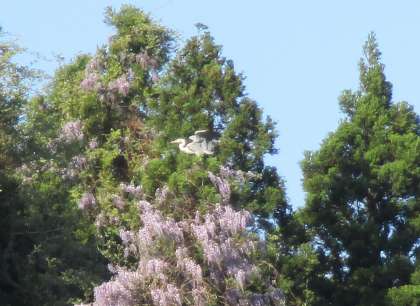 サギは非常に警戒心が強く、ちょっとした気配で逃げてしまいます。池の中にいるのを撮影した直後に、逃げていき、向かいの斜面にある木の頂上でしばらく様子をうかがってから、西の方へ飛んでいきました。