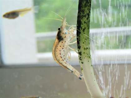 この水槽ではヒメダカと混泳していますが、熱帯魚と混泳させている人が多いそうです。ヤマトヌマエビは、雑食性で、藻類や小動物など、何でも食べ、水槽をきれいにしてくれます。前脚にあるはさみで餌を小さくちぎり、忙しく口に運ぶ動作を繰り返すので、見ていても飽きません。色もきれいです。