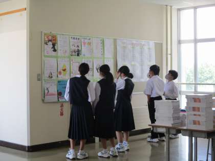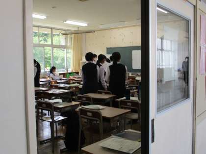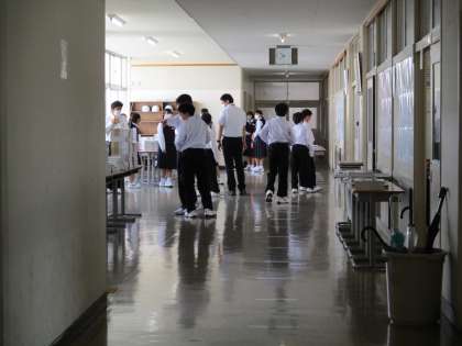 登校してきた生徒には、新しい生活様式の中で「ソーシャルディスタンス」について話をし、手洗いやトイレに関しても間隔を開けて並ぶようにテープを貼ったり、「くっつかないモン」の注意書きを貼ったりしました。