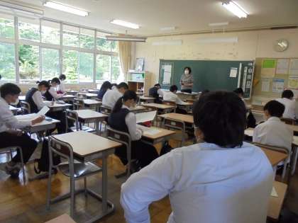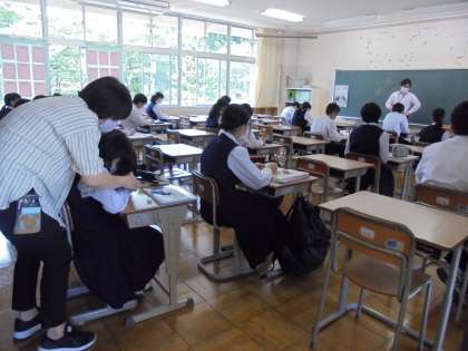 画像上は、23Hの国語です。中教研テストが返却され、解説を真剣に聞いています。