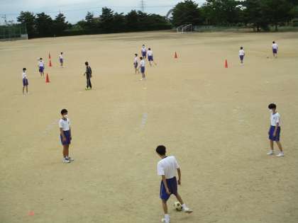 準備運動や軽いトレーニングをした後、サッカーのパス練習をしています。