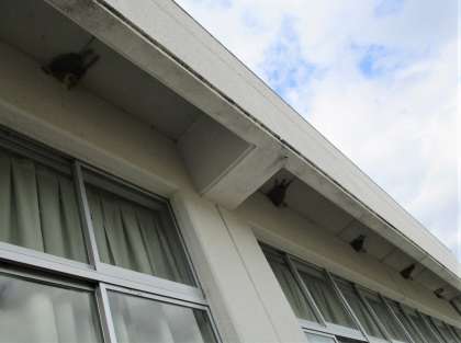 生徒が登校してくる上空をツバメがたくさん飛んでいるので、よく見ると、図書室のひさしに巣がたくさんありました。