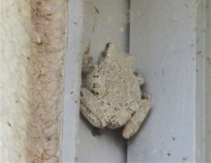 今朝も技術室北側の窓のサッシのところにカエルがいました。