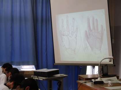 画像は12Hの美術。手のスケッチにハッチングで陰をつけています。