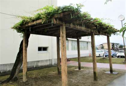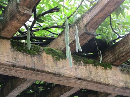 藤棚から種が入った鞘(さや)がぶら下がっています。
