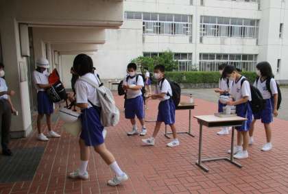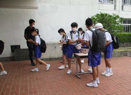 しかし、多くの生徒がマスクを着用して登校してきました。気を付けるということは、よいことだと思います。玄関でもしっかり手指の消毒をしています。