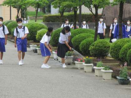 今朝もボランティア実践部の生徒が花壇とプランターの水やりをしてくれました。