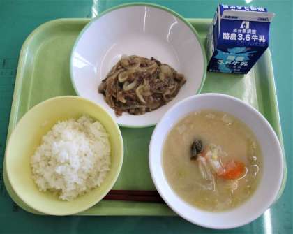 メニューは、ご飯、プルコギ、つみれ汁、牛乳 でした。プルコギをご飯にかけて、プルコギ丼として食べます。つみれ汁は、具だくさんになっていました。