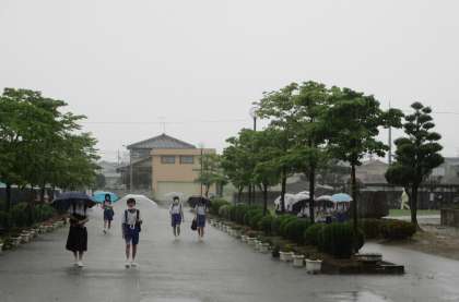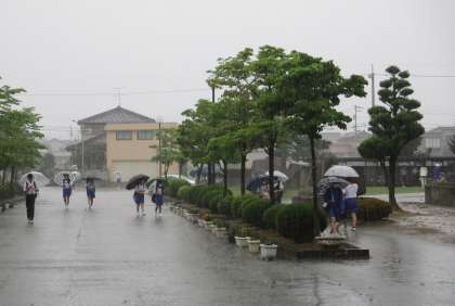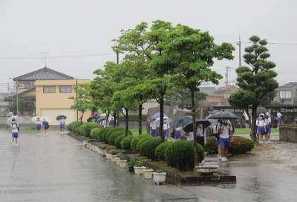 自転車通学の生徒の中には、7:45頃に家を出るときには雨が降っていなかったので、カッパを用意せずに登校し、全身ずぶ濡れになった生徒もいました。