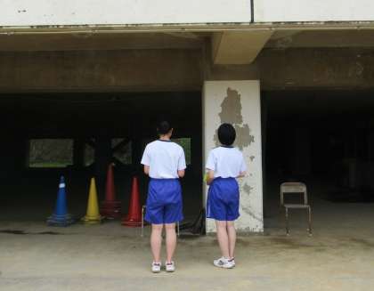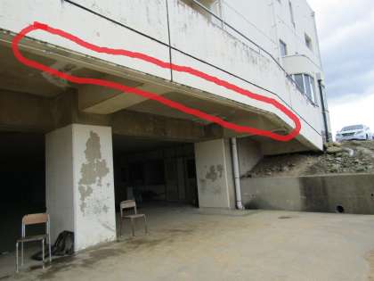 体育館下のピロティの入り口に、用務員さんがミスト発生装置を付けてくださいました。(画像の赤い線で囲った部分)少し、高い位置にありますが十分にミストを浴びることができます。