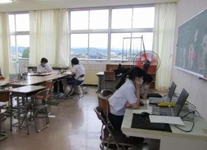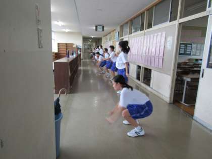 画像上:美術部の文芸部門 画像下:教室前でトレーニングする1年生