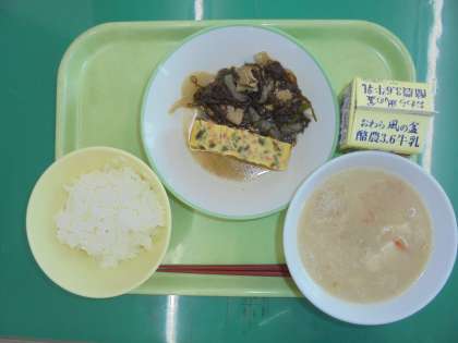 今日のメニューは、ごはん、千草焼き、もずくのチャプチェ、ごまけんちん、牛乳 でした。
