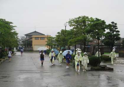 大雨警報が出ている中、登校できるかどうか心配される朝でした。一時的にやや強い雨脚もありましたが、生徒が登校できる程度の雨となり、8:20頃には、雨も上がりました。