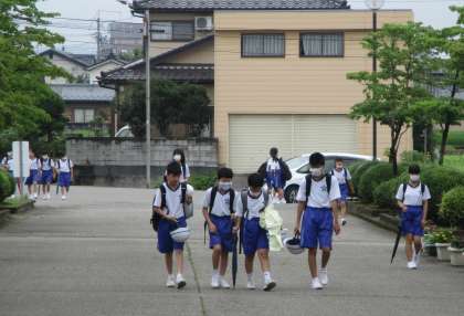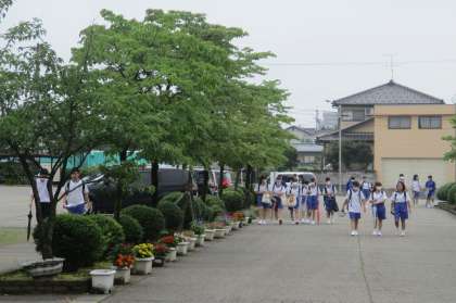 比較的涼しく、生徒は元気に登校しています。念のために傘を持っている生徒が多かったです。