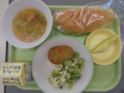 米粉パン、牛乳、白エビコロッケ、ブロッコリーサラダ、ひよこ豆のスープ、メロンです。