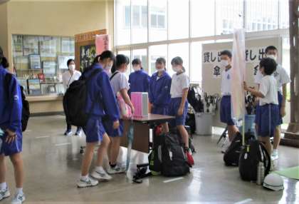 朝、7:50から生徒会執行部とボランティア実践部が、生徒玄関ホールで活動を行いました。たくさんの生徒が協力してくれました。