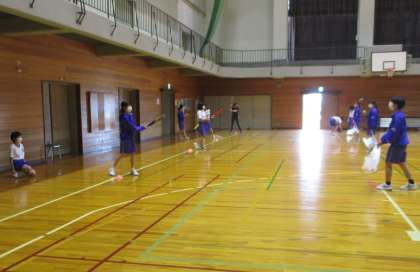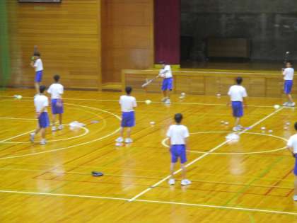 画像中、下:24H保健体育 ソフトボール 体育館で紙製のボールのトスバッティングをしていました