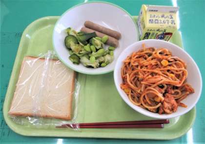 今日のメニューは、減量食パン、夏野菜スパゲッティ、ウインナー、枝豆サラダ、牛乳 でした。
