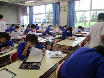 画像下:23H美術 トレーシングペーパーを使って模写をしていました