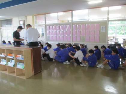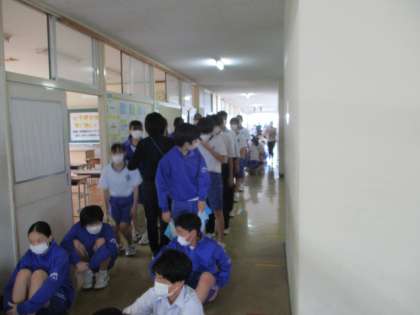 本来であればグラウンドに避難するのですが、グラウンドの状態が悪く、体育館では密になるため、今回は、廊下で整列し、人数確認をするまでを行いました。
