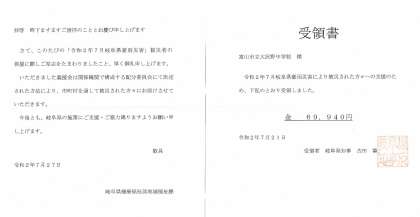 それに対するお礼の文書と受領書が本校に届きました。受取人は、「岐阜県知事 古田 肇」となっていました。