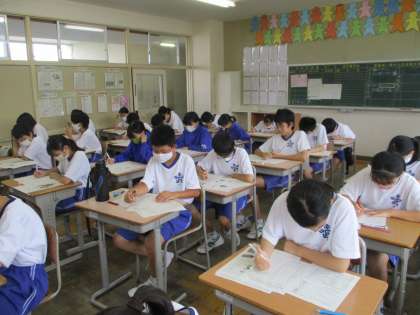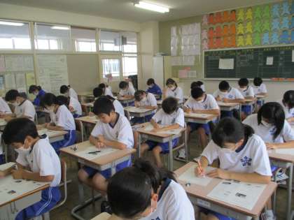 今日は、教室の温度も少し高くなりましたが、エアコンと扇風機を使い、換気にも注意してテストを行っています。