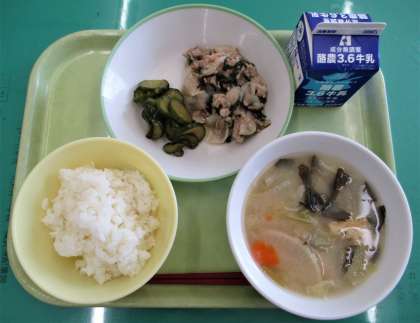 今日のメニューは、ごはん、豚肉の塩こうじ炒め、きゅうりの華風和え、すいとん、牛乳 でした。